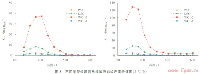 從烴源巖生烴演化規(guī)律分析,WC1-2和DSQ樣品具有相似的輕烴和重烴生成演化規(guī)律,即隨著溫度的升高,烴產(chǎn)率迅速增加,達到產(chǎn)率高峰后,隨著溫度的繼續(xù)升高烴產(chǎn)率反而下降。C14+重烴的高峰值對應溫度為360℃左右,而C6-14輕烴的高峰值對應的溫度為380~400℃,明顯滯后于重烴,說明在溫度高于360℃時液態(tài)烴中的重烴進一步裂解成輕烴,當溫度超過480℃時,幾乎不再有液態(tài)烴的產(chǎn)生。