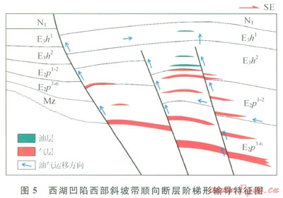 裂陷期同沉積斷裂為油氣垂向運(yùn)移的良好通道。西湖凹陷裂陷階段,張性正斷層發(fā)育,斷層大都具有開(kāi)啟性,且這一階段發(fā)育的正斷層一般都斷穿下部主要烴源層,成為油氣運(yùn)移主要的通道。如平湖斜坡帶油氣源主要為平湖組及其以下地層,決定了斷層為主要油氣通道,并形成與斷層有關(guān)的構(gòu)造型油氣藏。由于斷層具有良好的垂向輸導(dǎo)能力,常可形成距烴源層有較大時(shí)空跨度的含油氣層位,在斷層帶附近可以形成多層疊置的油氣藏。其次,斜坡帶上不整合面為油氣的次主要運(yùn)移通道,可以使油氣進(jìn)行長(zhǎng)距離的側(cè)向和斜向運(yùn)移[5],裂陷期斷裂與不整合面構(gòu)成了網(wǎng)狀的油氣輸導(dǎo)體系(圖5)。
