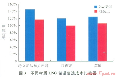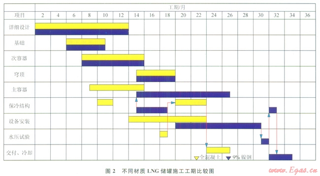全混凝土罐的應(yīng)用有很多優(yōu)點(diǎn)。首先,從材料角度講,國(guó)內(nèi)的9%鎳鋼材市場(chǎng)緊張,且9%鎳鋼雖已初步實(shí)現(xiàn)國(guó)產(chǎn)化,但價(jià)格依然昂貴。與之相比,混凝土材料容易獲得,成本較低。其次,全混凝土罐的平行施工工序多,建造工期短(圖2),因工期產(chǎn)生的費(fèi)用相對(duì)較低(圖3)。從圖2可以看出,全混凝土內(nèi)罐與外罐的平行施工搭接時(shí)間長(zhǎng),保冷結(jié)構(gòu)安裝與設(shè)備安裝可同時(shí)進(jìn);對(duì)于9%鎳鋼,外罐施工即將結(jié)束時(shí)才能進(jìn)行內(nèi)罐施工,保冷結(jié)構(gòu)安裝與設(shè)備安裝不存在搭接時(shí)間。常規(guī)的16×104m3儲(chǔ)罐工期約為33個(gè)月,而全混凝土罐的建造工期約為25個(gè)月,可節(jié)省工期8個(gè)月。工期縮短可使LNG儲(chǔ)罐提前投產(chǎn),也間接減小了LNG儲(chǔ)罐建造費(fèi)用。從圖3可以看出,采用全混凝土LNG儲(chǔ)罐至少可節(jié)約20%的建造成本[3]。最后,全混凝土LNG罐可以擴(kuò)大業(yè)主對(duì)承包商與設(shè)計(jì)單位的選擇范圍,優(yōu)化LNG儲(chǔ)罐的設(shè)計(jì)與建造市場(chǎng)。同時(shí)混凝土的應(yīng)用在全球經(jīng)驗(yàn)都較為成熟,人們對(duì)混凝土低溫特性的認(rèn)識(shí)也逐漸走向成熟[4]。
