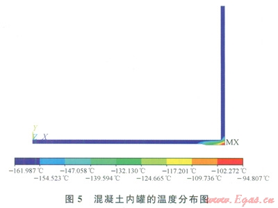 在正常運(yùn)行條件下,LNG蒸發(fā)氣與LNG共存,LNG儲(chǔ)罐的環(huán)境溫度在-162℃附近,由ANSYS模擬可確定,對(duì)于0.8m厚的罐壁,穩(wěn)定后內(nèi)罐外表面的溫度在-159℃附近。內(nèi)罐整體被凍透,所以不考慮凍融的影響。內(nèi)罐底板與罐壁的溫度分布如圖5所示。