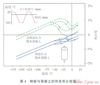 在檢修、維護(hù)的情況下,混凝土內(nèi)罐的局部溫度會(huì)有所升高,混凝土?xí)艿絻鋈谘h(huán)的影響。凍融循環(huán)試驗(yàn)表明[8]:在凍融循環(huán)的情況下,鋼筋與混凝土的黏結(jié)強(qiáng)度、混凝土的強(qiáng)度隨凍融循環(huán)次數(shù)的增加而降低,且高含水量的混凝土受影響較大,減小混凝土中的含水量是降低凍融循環(huán)損害的有效途徑。圖4為鋼筋與混凝土的熱變形比較圖。從圖4以看出,在預(yù)加壓力下,混凝土與鋼筋的熱膨脹系數(shù)接近,且呈線性變化,所以對(duì)混凝土施加預(yù)應(yīng)力,可有效提高鋼筋與混凝土的黏結(jié)性能,提高混凝土耐久性[12];快速有效的檢修、維護(hù)方案、管理制度也是降低凍融損害的有效辦法。