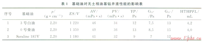 使用3號(hào)白油、0號(hào)柴油和氣質(zhì)油Saraline 185V作為體系的基礎(chǔ)油,測(cè)試了不同基礎(chǔ)油配制的無(wú)土相油基鉆井液性能,試驗(yàn)結(jié)果見(jiàn)表1所示。