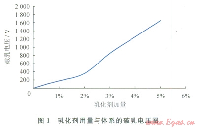 當(dāng)乳化劑加量大于3%時(shí),體系的破乳電壓增加較快,加量為3%時(shí),體系的破乳電壓達(dá)到850V,而當(dāng)乳化劑加量5%時(shí)體系的破乳電壓已經(jīng)達(dá)到1650V??紤]當(dāng)乳化劑加量為3%時(shí),體系的破乳電壓已經(jīng)能夠滿足需要。因此選用乳化劑加量為3%。