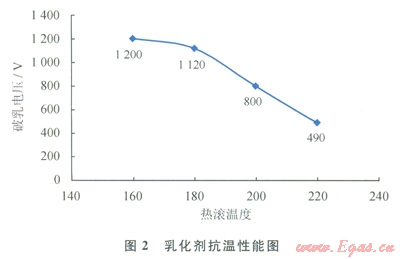 測(cè)試了不同溫度熱滾前后體系的電穩(wěn)定性,以此考察乳化劑的抗溫性能。由圖2可知,熱滾后的破乳電壓均高于400V,但200℃以上破乳電壓下降較快。因此將該乳化劑適宜的溫度定為200℃以?xún)?nèi)。