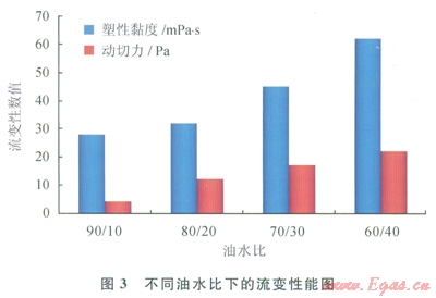 通過(guò)測(cè)試高密度不同油水比條件下鉆井液的流變性能,優(yōu)選了高密度條件下無(wú)土相油基鉆井液的最佳油水比范圍(圖3)。