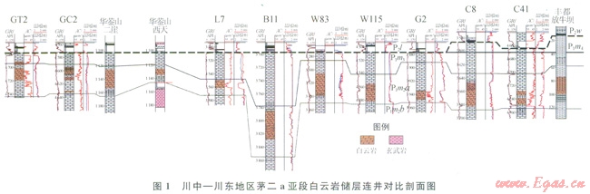 對川東、川中地區(qū)鉆揭中二疊統(tǒng)鉆井的鉆錄井資料重新梳理,系統(tǒng)研究巖心、巖屑、電測資料,并對中二疊統(tǒng)野外露頭剖面(華鎣山二崖剖面、西天剖面、李子埡剖面,豐都暨龍鎮(zhèn)烏羊壩剖面、放牛壩剖面,豐都武平大壩剖面)進行仔細觀測,筆者發(fā)現(xiàn)[2],川東—中局部地區(qū)中二疊統(tǒng)茅口組茅二a亞段內(nèi)發(fā)育一套最厚為30m的白云巖、硅質(zhì)白云巖儲層(圖1)。
