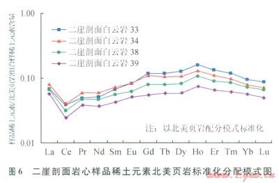 稀土元素能有效區(qū)分熱水成因沉積物與非熱水水成沉積的沉積物,前者REE總量低,Ce為負異常,Eu為正異常,HREE富集;后者REE含量高,Eu為負異常或無異常,HREE不富集[9-12]。川東地區(qū)多條野外露頭剖面(華鎣山二崖、華鎣山閻王溝、華鎣山仙鶴洞、石柱冷水溪)和鉆井巖心樣品白云巖(圖6,以華鎣山二崖剖面為例)的稀土元素北美頁巖標準化分配模式均可以看出,其沉積以熱水沉積為主,混有少量非熱水的水成沉積物。