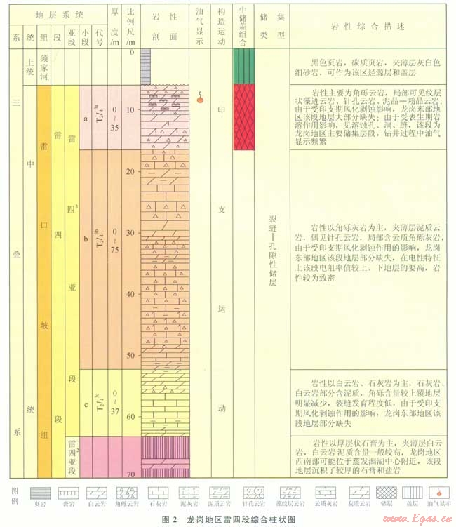 從全盆地雷口坡組巖溶格局來講,古隆起處于高部位,地層剝蝕程度大,為巖溶高地;凹陷內(nèi)地層剝蝕程度弱,保留了雷四段的區(qū)域?yàn)閹r溶洼地,其間的區(qū)域?yàn)閹r溶斜坡。巖溶對(duì)儲(chǔ)層的改造以巖溶高地最好,次為巖溶斜坡,巖溶凹陷最差,但處于巖溶凹陷的龍崗地區(qū)反而獲得了新的發(fā)現(xiàn)。