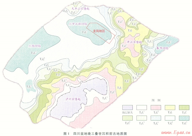 中三疊世末,伴隨著印支運(yùn)動(dòng)的發(fā)生,地臺(tái)整體抬升形成大規(guī)模的海退,上揚(yáng)子地臺(tái)由此結(jié)束了以海相沉積為主的歷史,進(jìn)入以陸相沉積為主的時(shí)期,地層遭受剝蝕。在此過程巾形成了隆起與凹陷,盆地內(nèi)展現(xiàn)為三隆三凹的格局(圖1)。三隆指南側(cè)瀘州古隆起、北側(cè)開江古隆起以及北西邊緣廣元江油附近的天井山古隆起,三凹是指川西凹陷(包括德陽—成都—大邑—邛崍—眉山—雅安地區(qū)和樂山—犍為地區(qū))、川中北部凹陷(包括蒼溪—閬中—儀隴地區(qū))和川東北的奉節(jié)凹陷。隆起中心地層遭受剝蝕程度大,瀘州古隆起頂部雷口坡組剝蝕殆盡,開江占隆起殘存雷一段,在凹陷內(nèi)剝蝕程度相對(duì)較弱,均保留了雷四段。