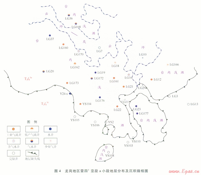 3)在大型地層尖滅的背景上,受構(gòu)造、斷層和巖性變化影響,發(fā)育地層 構(gòu)造、巖性一構(gòu)造等多種圈閉類型。雷四3亞段a小段尖滅帶附近的次級(jí)巖溶斜坡是尋找工業(yè)氣井的最有利區(qū)。