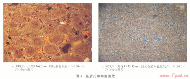 儲(chǔ)層基質(zhì)孔隙類型有粒間溶孔、晶間溶孔、粒內(nèi)溶孔、鑄模孔和體腔孔,其中粒間溶孔、晶間溶孔是主要的孔隙類型,其發(fā)育程度直接影響到儲(chǔ)層的儲(chǔ)集能力。