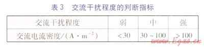 GB/T 50698—2011《埋地鋼質(zhì)管道交流干擾防護技術(shù)標準》中第3.0.5條規(guī)定:“當管道上的交流干擾電壓不高于4V時,可不采取交流干擾防護措施;高于4V時,應(yīng)采用交流電流密度進行評估。”高于4V時的交流干擾程度的判斷指標參照GB/T 50698—2011《埋地鋼質(zhì)管道交流干擾防護技術(shù)標準》中3.0.6條(見表3)。