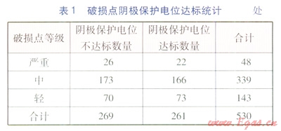 測得530處防腐層破損點管道電位分布情況是:261處防腐層破損點極化電位為-950~-850mV,達到最小保護電位要求(-850mV),破損點陰極保護電位達標統(tǒng)計見表1。