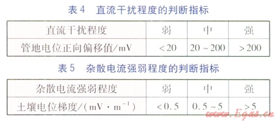 SY/T 0017—2006《埋地鋼質(zhì)管道直流排流保護技術(shù)標準》中第3.0.1條規(guī)定:“處于直流電氣化鐵路、陰極保護系統(tǒng)及其他直流干擾源附近的管道,應(yīng)進行干擾源側(cè)和管道側(cè)兩方面的調(diào)查測試。當管道任意點上的管地電位較自然電位偏移20mV或管道附近土壤電位梯度大于0.5mV/m時,確認為直流干擾。”第3.0.2條規(guī)定,管道直流干擾程度一般按管地電位較自然電位正向偏移值按表4所列指標判定;當管地電位較自然電位正向偏移值難以測取時,可采用土壤電位梯度按表5所列指標來判斷雜散電流的強弱程度。
