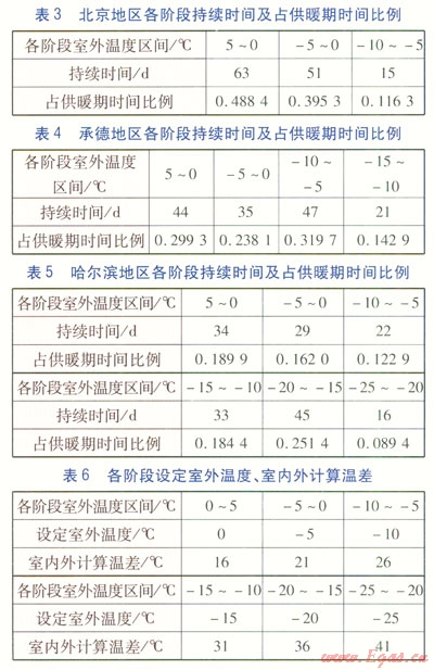 下面以北京、承德、哈爾濱地區(qū)為例,分析分布式循環(huán)泵供熱系統(tǒng)節(jié)能率的影響因素。北京、承德、哈爾濱地區(qū)各階段持續(xù)時(shí)間及占供暖期時(shí)間比例分別見表3~5。各階段設(shè)定室外溫度、室內(nèi)外計(jì)算溫差見表6。根據(jù)表3~6數(shù)據(jù),并依據(jù)相關(guān)規(guī)范設(shè)定3個(gè)地區(qū)建筑物圍護(hù)結(jié)構(gòu)熱工參數(shù)。經(jīng)計(jì)算呵得到,北京、承德、哈爾濱地區(qū)采用分布式循環(huán)泵供熱系統(tǒng)的節(jié)能率分別為20.0%、19.7%、18.5%。