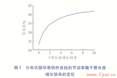 在設(shè)定室外溫度為-8℃的情況下,分布式循環(huán)泵供熱系統(tǒng)的節(jié)功率隨干管長(zhǎng)度增長(zhǎng)倍率(各段干管長(zhǎng)度同步增長(zhǎng))的變化見圖3。由圖3可知,隨著干管長(zhǎng)度增長(zhǎng)倍率的增大,分布式循環(huán)泵供熱系統(tǒng)的節(jié)功率隨之增大。