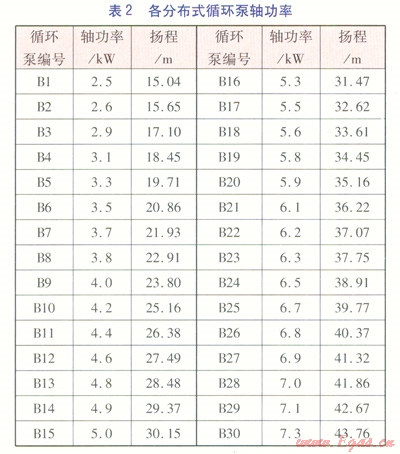 對(duì)于分布式循環(huán)泵供熱系統(tǒng),將零壓差點(diǎn)設(shè)定在熱源出口。熱源循環(huán)泵的質(zhì)量流量與傳統(tǒng)供熱系統(tǒng)循環(huán)泵質(zhì)量流量一致,為1290t/h;揚(yáng)程僅用于克服熱源內(nèi)部水頭損失,因此熱源循環(huán)泵揚(yáng)程為15m。經(jīng)計(jì)算,設(shè)計(jì)工況下熱源循環(huán)泵軸功率為75.3kW。分布式循環(huán)泵的質(zhì)量流量為其所在支路熱力站的質(zhì)量流量,揚(yáng)程用于克服熱力站的水頭損失,以及熱力站之前的一切管網(wǎng)水力損失。經(jīng)計(jì)算,設(shè)計(jì)工況下各分布式循環(huán)泵的軸功率見表2。
