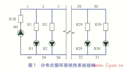 某供熱系統(tǒng)共有30座熱力站,供、回水設(shè)計(jì)溫度為l30、70℃,各熱力站設(shè)計(jì)熱負(fù)荷均為3MW,水頭損失均為10m,各熱力站所在支管長(zhǎng)度為400m,支管水頭損失為4.38m,熱源內(nèi)部水頭損失為15m。分布式循環(huán)泵供熱系統(tǒng)結(jié)構(gòu)見圖1,圖中R1~R30為熱力站編號(hào),1~60為干管管段編號(hào),80為熱源循環(huán)泵編號(hào),81~B30為分布式循環(huán)泵編號(hào)。若取消分布式循環(huán)泵,則分布式循環(huán)泵供熱系統(tǒng)則變成傳統(tǒng)供熱系統(tǒng)。各干管管段計(jì)算參數(shù)見表1,各干管管段長(zhǎng)度均為100m。各熱力站所在支管的比摩阻均為42.1Pa/m,供熱系統(tǒng)中所有水泵的效率均按0.7計(jì)算。