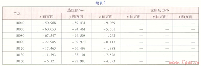 輸入數(shù)據(jù):熱水溫度130℃,設(shè)計(jì)壓力1.6MPa,管材Q2358,管道外直徑1220mm,直管壁厚16mm,彎頭壁厚18mm。其他參數(shù)可通過(guò)AutoPSA應(yīng)力分析軟件,實(shí)現(xiàn)手動(dòng)調(diào)用或自動(dòng)調(diào)用。建立好的計(jì)算模型經(jīng)AutoPSA應(yīng)力分析軟件分析計(jì)算,得到一次應(yīng)力、二次應(yīng)力、熱位移、支座反力。應(yīng)力驗(yàn)算結(jié)果見表1,熱位移、支座反力見表2。由表1可知,供熱管道各單元的一次應(yīng)力、二次應(yīng)力均滿足《規(guī)范》要求。表2數(shù)據(jù)可作為結(jié)構(gòu)專業(yè)設(shè)計(jì)桁架的基礎(chǔ)數(shù)據(jù),表中負(fù)號(hào)表示方向與坐標(biāo)軸正向相反。