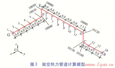 架空供熱管道計(jì)算模型見圖3,圖中數(shù)值單位為m。其中節(jié)點(diǎn)1、14為固定支架,節(jié)點(diǎn)2~13為滑動(dòng)支架,節(jié)點(diǎn)l0010、10040、10050、10080、10090、10120、10130、10160為彎頭應(yīng)力計(jì)算節(jié)點(diǎn)。