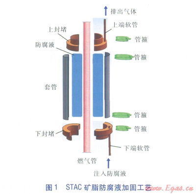 具體施工方案見(jiàn)圖1。首先在燃?xì)饬⒐艽┰綁痛前逄幖犹坠?/span>(由2部分拼合而成),套管上下端邊緣處追加管箍(用于固定套管)并安裝上下封堵,套管上下封堵安裝好后分別追加管箍(用于固定封堵);分別將2段軟管插入上下封堵的注液孔中,通過(guò)下端軟管向套管和燃?xì)饬⒐苤g注入STAC礦脂防腐液(以下簡(jiǎn)稱防腐液),最后對(duì)軟管進(jìn)行封口。