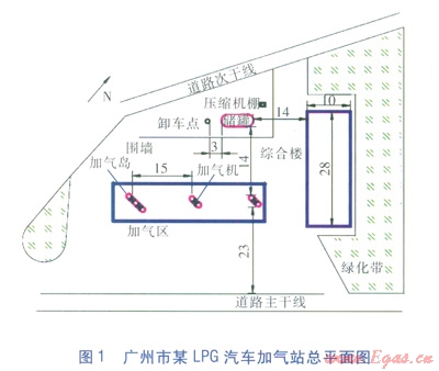加氣區(qū)設(shè)有3個加氣島,加氣島寬度為1.2m,靠站區(qū)西南側(cè)的一個加氣島設(shè)置有2臺6槍加氣機(jī),其余兩個加氣島各設(shè)置1臺6槍加氣機(jī)。加氣機(jī)與綜合樓的最小距離為14m,與東面道路主干線邊沿的距離為23m;此外,該LPG加氣站周邊100m范圍內(nèi)沒有學(xué)校、醫(yī)院、幼兒園和其他黿要公共設(shè)施。