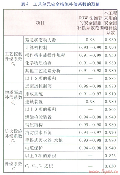 本工藝單元的安全措施補(bǔ)償系數(shù)的取值詳見表4。