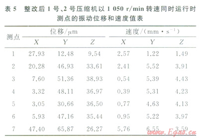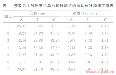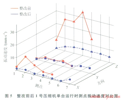 按照?qǐng)D3的整改參數(shù)完成了工藝管線的現(xiàn)場(chǎng)整改,整改前后現(xiàn)場(chǎng)如圖4所示。為評(píng)價(jià)減振理效果,完成了1號(hào)壓縮機(jī)單臺(tái)運(yùn)行和1號(hào)、2號(hào)壓縮機(jī)同時(shí)運(yùn)行兩種工況的現(xiàn)場(chǎng)測(cè)試。測(cè)點(diǎn)的布置情況如圖4所示,測(cè)點(diǎn)的方向與整改前一致,其中1號(hào)壓縮機(jī)單臺(tái)運(yùn)行參數(shù)及測(cè)點(diǎn)的振動(dòng)位移和速度值分別見表3、4,1號(hào)、2號(hào)壓縮機(jī)同時(shí)運(yùn)行時(shí)測(cè)點(diǎn)的振動(dòng)位移和速度值見表5,整改前后l號(hào)壓縮機(jī)單臺(tái)運(yùn)行時(shí)測(cè)點(diǎn)振動(dòng)速度對(duì)比圖如圖5所示。