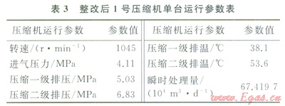 數(shù)據(jù)分析得出:①由圖5知,工藝管線整改后,1號(hào)壓縮機(jī)單臺(tái)運(yùn)行時(shí)管線的振動(dòng)位移和速度大大降低,最大位移為47.2mm,最大振動(dòng)速度為5.18mm/s,遠(yuǎn)低于限定值;②相比1號(hào)壓縮機(jī)單臺(tái)運(yùn)行而言,1號(hào)、2號(hào)壓縮機(jī)同時(shí)運(yùn)行時(shí)工藝管線的振動(dòng)略微增加,最大位移為65.87mm,最大速度為6.55mm/s,但都在標(biāo)準(zhǔn)范圍之內(nèi);③1號(hào)壓縮機(jī)單臺(tái)運(yùn)行時(shí),測(cè)點(diǎn)B處的波峰壓力為4.128MPa,波谷壓力為4.115MPa,壓力不均勻度為0.3%,低于壓力脈動(dòng)限制值0.54%(API 618);④由于1號(hào)、2號(hào)兩臺(tái)壓縮機(jī)同時(shí)運(yùn)行時(shí),處理量達(dá)到了119.52×104m3/d,增壓站的處理能力得到較大提升;⑤另外,3號(hào)、4號(hào)壓縮機(jī)共用另一匯氣管,工藝管線振動(dòng)情況與1號(hào)、2號(hào)壓縮機(jī)運(yùn)行時(shí)基本一致,管線振動(dòng)也滿足標(biāo)準(zhǔn)要求。