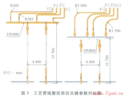 結(jié)合現(xiàn)場(chǎng)實(shí)際,從消減激振力{F}、管線設(shè)計(jì)相關(guān)標(biāo)準(zhǔn)和現(xiàn)場(chǎng)操作工藝方面綜合分析,確定了如下的治理措施:①考慮設(shè)備檢修和倒流程操作,采用2個(gè)獨(dú)立的匯氣管,2個(gè)匯氣管出口分別連接到1號(hào)、2號(hào)和3號(hào)、4號(hào)壓縮機(jī);②按照一般匯氣管的流通面積應(yīng)大于進(jìn)氣管流通面積總和3倍的要求,增加匯氣管直徑和緩沖容積[12];③減少彎頭以及增加彎頭的曲率半徑;④縮短管線長(zhǎng)度以增加管線剛度、合理布置支承。工藝管線整改前后關(guān)鍵參數(shù)對(duì)比如圖3所示。