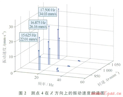 導(dǎo)致管線振動(dòng)因素很多,主要有管線系統(tǒng)結(jié)構(gòu)的固有頻率落在共振區(qū)引發(fā)的機(jī)械共振,管流的氣柱同有頻率落在共振區(qū)引發(fā)的氣柱共振,壓力脈動(dòng)過大引起的管道振動(dòng),以及動(dòng)力平衡性差引起的振動(dòng)[7]。為了全面分析工藝管線振動(dòng)的原因,根據(jù)機(jī)組的實(shí)際情況,采用便攜式振動(dòng)測(cè)試儀對(duì)管線的關(guān)鍵部位進(jìn)行了現(xiàn)場(chǎng)測(cè)試。振動(dòng)測(cè)點(diǎn)1~5的位置及方向、壓力脈動(dòng)測(cè)點(diǎn)A的位置見圖1。測(cè)試工況為:①1號(hào)壓縮機(jī)在3種不同轉(zhuǎn)速下單臺(tái)運(yùn)行;②1號(hào)壓縮機(jī)轉(zhuǎn)速為1050r/min,窄載和負(fù)載運(yùn)行;③測(cè)點(diǎn)A處的壓力脈動(dòng)測(cè)試。測(cè)試結(jié)果包括測(cè)點(diǎn)的振動(dòng)位移、振動(dòng)速度、壓力脈動(dòng)以及測(cè)點(diǎn)振動(dòng)速度的頻譜特性。鑒于測(cè)試數(shù)據(jù)較多,只列出了具有代表性的測(cè)試結(jié)果,其中1號(hào)壓縮機(jī)運(yùn)行參數(shù)和測(cè)點(diǎn)的振動(dòng)值分別見表1、2,測(cè)點(diǎn)4在Z方向的振動(dòng)速度頻譜見圖2。結(jié)合國(guó)內(nèi)外機(jī)械振動(dòng)測(cè)量與評(píng)價(jià)的相關(guān)標(biāo)準(zhǔn),確定管線振動(dòng)烈度級(jí)為18,振動(dòng)位移界限值為283mm,振動(dòng)速度界限值為17.8mm/s[8-9]。
