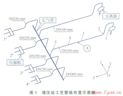 某增壓站是一座集采、集、輸、增壓功能為一體的大型集輸站,設(shè)計(jì)處理規(guī)模為183×104m3/d,設(shè)計(jì)壓力為8.0MPa。壓縮機(jī)組由3臺(tái)(1號(hào)、2號(hào)、3號(hào))功率為1250kW和1臺(tái)(4號(hào))功率為1030kW的大型往復(fù)式壓縮機(jī)組成,壓縮機(jī)結(jié)構(gòu)為水平對(duì)稱平衡型,采用燃?xì)獍l(fā)動(dòng)機(jī)驅(qū)動(dòng)。增壓站工藝管線布置情況如圖1所示,分離器出口管道與匯氣管連接,匯氣管出口管道與壓縮機(jī)連接。增壓站自投運(yùn)以來,壓縮機(jī)組運(yùn)行參數(shù)達(dá)到設(shè)計(jì)要求,但管道系統(tǒng)振動(dòng)異常,無法運(yùn)行多臺(tái)壓縮機(jī)組,嚴(yán)重制約了生產(chǎn)產(chǎn)量。雖采取了強(qiáng)化管道支承、加固連接底座等減振措施,但減振效果不佳。