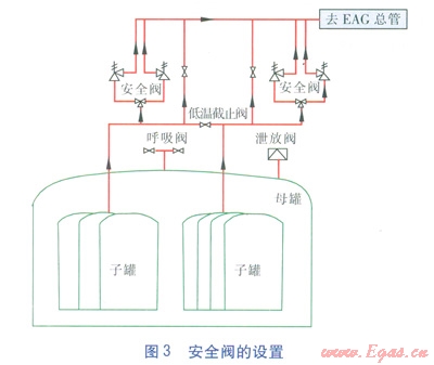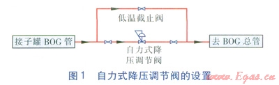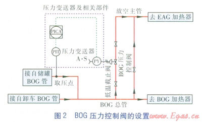 BOG壓力控制閥為氣動式薄膜凋節(jié)閥,設(shè)置于自力式降壓調(diào)節(jié)閥后、BOG總管的支管路上,進口與BOG總管連接,出口與放空主管連接,取壓點設(shè)置在BOG壓力控制閥前儲罐BOG管上,當(dāng)取壓點壓力達(dá)到設(shè)定值時,閥門開啟,實現(xiàn)少量放散。BOG壓力控制閥的設(shè)置見圖2(圖2中EAG指安全放散氣體)。