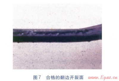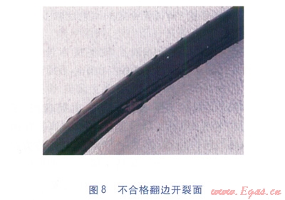 合格的判定:翻邊不開裂,或者即使開裂,開裂面是韌性開裂面(見圖7),判定為合格;翻邊發(fā)生開裂,并且開裂面是光滑平整的脆性開裂面(見圖8),判定為不合格。對于判定不合格的接頭需割除接頭重新焊接,如果不合格的數(shù)量較多,但翻邊脆性開裂長度小于25%,則應該通過選取典型試件做拉伸性能試驗來最終確定該類焊接接頭是否合格。