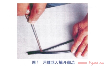 我單位于2012年敷設了一段DN 250mm聚乙烯燃氣管道(SDR11 PE100),依照規(guī)范的規(guī)定對某熱熔對接連接接頭質量進行了檢驗,在翻邊對稱性檢驗和接頭對正性檢驗均合格的前提下,對其進行了翻邊切除檢驗,切削下來的翻邊條外觀檢驗合格,翻邊背彎(每隔50mm進行180°背彎)試驗時,亦未出現(xiàn)開裂、裂縫及熔合線裸露,該對接接頭質量判定為合格。但偶然情況下,發(fā)現(xiàn)該檢驗合格的翻邊,使用一字形螺絲刀可以在局部某一段沿熔合面撬開(見圖1),而且分開的熔合面光滑平整,我們推斷該接頭質量不合格。于是,對所有已經(jīng)完成的且檢驗合格的對接接頭翻邊進行了加強檢查,包括一字形螺絲刀撬、最大限度的扭曲拉伸等,這樣又找到了多個同類問題的翻邊。由此,對規(guī)范規(guī)定的翻邊切除檢驗方法能否有效證明熱熔對接連接接頭質量合格提出了疑問。