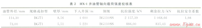 根據(jù)實鉆資料可知Æ177.8mm套管和Æ127.0mm懸掛尾管的詳細情況如表1。生產(chǎn)套管安全強度校核顯示,儲層改造時靜壓條件下生產(chǎn)套管允許最高套壓為64.15MPa,排液測試時井口壓力可以放至0,關(guān)井時純天然氣條件下最高控制套壓64.15MPa(高于預計的天然氣井口最高關(guān)井壓力46.58MPa)。儲層改造工況,在給定的施工參數(shù)條件下,生產(chǎn)套管抗內(nèi)壓安全系數(shù)1.27(大于標準要求的安全系數(shù)1.25)。