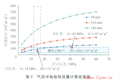 在氣田生產(chǎn)過程中,為了進(jìn)一步分析產(chǎn)量過高的原因產(chǎn)生的沖蝕,開展了不同單井井口壓力和產(chǎn)量下的臨界沖蝕流量的計算。根據(jù)氣田的具體情況,井口設(shè)備的節(jié)流閥通徑分別為78mm、103mm、130mm。因此,分別計算了氣田工況范圍下的單井極限沖蝕流量。根據(jù)計算結(jié)果可以看到,將2口典型井在試氣時的工況標(biāo)在計算圖(圖4)中,2口井均在沖蝕流量之下(圖5)。在氣田生產(chǎn)中,根據(jù)開發(fā)配產(chǎn),建議井口產(chǎn)氣量限制在70×104~95×104m3/d,少數(shù)井配產(chǎn)在100×104m3/d或以上時,井口閥的尺寸要求換成100.5mm。由此確定井口采氣樹選擇如下:產(chǎn)量小于80×104m3/d,主通徑(標(biāo)稱尺寸)為78mm;產(chǎn)量在80×104~200×104m3/d,主通徑為103mm;產(chǎn)量大于200×104m3/d,主通徑為130mm。
