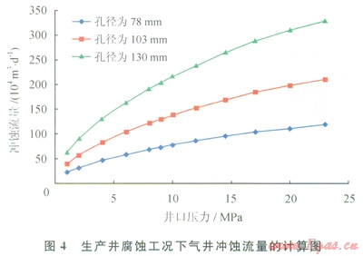 計算了不同井口壓力下不同孔徑尺寸(標(biāo)稱尺寸,最小內(nèi)徑)沖蝕流量(圖4),計算的生產(chǎn)工況范圍按照氣田的實(shí)際情況確定。根據(jù)計算,油壓為15~18MPa,井口溫度為60~70℃,Æ78mm節(jié)流閥抗沖蝕流量為85×104~112×104m3/d。氣田的產(chǎn)量最高達(dá)126×104m3/d,一般井產(chǎn)量均大于85×104m3/d。因此,生產(chǎn)過程中長期存在沖蝕現(xiàn)象,這是井口腐蝕嚴(yán)重的重要原因之一。根據(jù)計算結(jié)果,在目前的工況下,為避免沖蝕和安全生產(chǎn),一些單井產(chǎn)量最好控制在85×104m3/d以下。