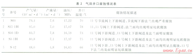 氣田正在生產(chǎn)的部分典型井具體情況見表2。井的產(chǎn)氣量從48×104~95×104m3/d,油壓為16~18MPa,井口溫度為66~78℃。腐蝕情況的主要表現(xiàn)為節(jié)流閥上下游閥道、法蘭面均出現(xiàn)明顯坑狀腐蝕。地層主要是碳酸鹽巖,生產(chǎn)過程中沒有出現(xiàn)井口固體砂粒的現(xiàn)象。從腐蝕情況來看,并不是僅有高產(chǎn)井出現(xiàn)了井口腐蝕。分析腐蝕的發(fā)生不僅與產(chǎn)量有關(guān),顯然也與溫度和壓力有一定的關(guān)系,處于經(jīng)濟(jì)考慮而選擇的節(jié)流閥材質(zhì)偏低也是原因之一。在氣田進(jìn)行完井生產(chǎn)管柱設(shè)計時,對油管進(jìn)行了沖蝕極限速度的校核,選擇了Æ88.9mm為主的生產(chǎn)油管。但是井口的部分節(jié)流閥尺寸小于油管尺寸,對沖蝕腐蝕沒有進(jìn)行重點(diǎn)研究。由此推斷,腐蝕的主要因素不僅是化學(xué)腐蝕,更有可能來源于沖蝕腐蝕。因此,進(jìn)行沖蝕極限速度的計算來判定腐蝕是必要的。