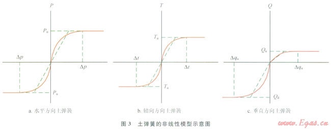 根據(jù)ASCE Guidelines.for the Design of Buried Steel Pipe[21,斷層作用下,土壤對(duì)管道的作用可以用彈塑性土彈簧來(lái)表示,包括管道軸向、側(cè)向和垂向的土彈簧(圖2)。筆者采用管土相互作用(PSI)單元模擬管土相互作用,PSl單元如圖2-b所示,由4個(gè)節(jié)點(diǎn)組成,單元上端2個(gè)節(jié)點(diǎn)(3和4)與地表面相連,反映地面運(yùn)動(dòng)與位移,下端2個(gè)節(jié)點(diǎn)(1和2)與管道單元相連,管土相互作用關(guān)系以非線性單元?jiǎng)偠缺硎?,單元?jiǎng)偠扰c土彈簧剛度一致。通過(guò)將斷層位移施加在斷層右側(cè)PSI單元的土壤節(jié)點(diǎn)上可以來(lái)模擬斷層的作用。等效土彈簧的力學(xué)性能可以用極限抗力與屈服位移2個(gè)量來(lái)描述。Pu、Tu、Qu和Qd代表了3個(gè)方向的極限抗力,Dp、Dt、Dqd和Dqu代表了3個(gè)方向的屈服位移(圖3)。