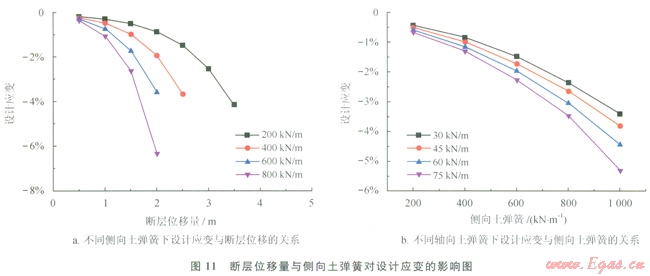 使用同樣的方法分析側(cè)向土彈簧對(duì)設(shè)計(jì)應(yīng)變的影響(圖11)。對(duì)比圖11和圖10,可以得到設(shè)計(jì)應(yīng)變隨側(cè)向土彈簧的變化形式與軸向土彈簧類似。從圖11-a可以發(fā)現(xiàn),側(cè)向土彈簧越大,設(shè)計(jì)應(yīng)變?cè)酱螅O(shè)計(jì)應(yīng)變?cè)诓煌瑐?cè)向土彈簧下與斷層位移量均保持類似冪函數(shù)關(guān)系;從圖11-b可以發(fā)現(xiàn),設(shè)計(jì)應(yīng)變隨側(cè)向土彈簧也保持著類似冪函數(shù)的關(guān)系。