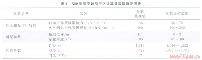 根據(jù)“西氣東輸二線”工程管道的實(shí)際運(yùn)行參數(shù)與沿途斷層參數(shù),對(duì)模型計(jì)算參數(shù)進(jìn)行取值,得到的模型計(jì)算參數(shù)范圍如表1所示。這里需要說(shuō)明的是,直接研究斷層對(duì)管道在空間中造成的錯(cuò)動(dòng)雖然更加符合實(shí)際,但該情況下影響參數(shù)眾多,很難得到設(shè)計(jì)應(yīng)變與各影響參數(shù)間的準(zhǔn)確關(guān)系與回歸公式。所以筆者只討論管道錯(cuò)動(dòng)分解后位于水平面內(nèi)的情況。當(dāng)分析管道在水平面內(nèi)錯(cuò)動(dòng)時(shí),垂直向上與向下的土彈簧對(duì)管道的應(yīng)變不再產(chǎn)生任何影響,所以可以不用考慮。而管道的軸向土彈簧與側(cè)向土彈簧的取值范圍由“西氣東輸二線”中出現(xiàn)的管道埋深、回填土和場(chǎng)地土性質(zhì)參考ASCE Guidelines for the Design 0/Buried Steel Pipe方法進(jìn)行計(jì)算確定??梢缘玫礁鲄?shù)取值范圍如表1所示。