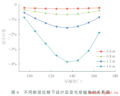 為了更深入分析設(shè)計(jì)應(yīng)變與穿越角度的關(guān)系,圖6給出了不同斷層位移下設(shè)計(jì)應(yīng)變隨穿越角度的變化關(guān)系。從圖6可以看出,當(dāng)斷層位移量小于0.8m時(shí),設(shè)計(jì)應(yīng)變較小,變化也較?。划?dāng)斷層位移量大于0.8m時(shí),設(shè)計(jì)應(yīng)變隨著穿越角度的增大先增大后減小,在所有斷層位移下,設(shè)計(jì)應(yīng)變與穿越角度之間存在著相似的函數(shù)關(guān)系,可以用二次多項(xiàng)式來(lái)描述。