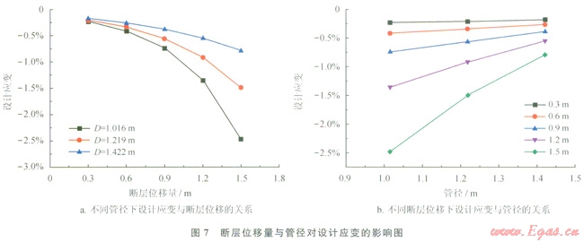 圖7、8給出了不同斷層錯(cuò)動(dòng)位移下管徑和壁厚對(duì)設(shè)計(jì)應(yīng)變的影響。從圖7-a和圖8-a可以看出,管徑和壁厚越大,設(shè)計(jì)應(yīng)變?cè)叫?,但在不同的管徑和壁厚下設(shè)計(jì)應(yīng)變和斷層錯(cuò)動(dòng)量都保持著相似的函數(shù)關(guān)系。圖7-b和圖8-b給出了不同斷層位移下設(shè)計(jì)應(yīng)變與管徑和壁厚的變化規(guī)律,可以看出,設(shè)計(jì)應(yīng)變隨管徑和壁厚的變化規(guī)律比較一致,也可以用冪函數(shù)來(lái)描述。
