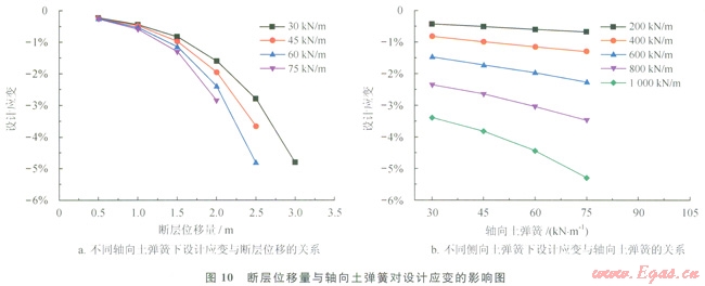 通過(guò)研究不同土彈簧的取值影響來(lái)考慮土壤特性對(duì)管道設(shè)計(jì)應(yīng)變的影響,圖10給出了不同軸向和側(cè)向土彈簧下設(shè)計(jì)應(yīng)變的變化規(guī)律。由圖10-a可以得到,軸向土彈簧越大,設(shè)計(jì)應(yīng)變?cè)酱?。在不同軸向土彈簧下管道設(shè)計(jì)應(yīng)變隨斷層位移量的變化形式保持一致,依舊保持著類似冪函數(shù)的關(guān)系。這里分析不同側(cè)向土彈簧下應(yīng)變隨軸向土彈簧的變化規(guī)律來(lái)分析軸向和側(cè)向土彈簧的相互影響,從圖10-b可以發(fā)現(xiàn),在不同側(cè)向土彈簧下設(shè)計(jì)應(yīng)變隨軸向土彈簧保持單調(diào)的規(guī)律,軸向土彈簧越大設(shè)計(jì)應(yīng)變?cè)酱?,同時(shí)側(cè)向土彈簧越大設(shè)計(jì)應(yīng)變也越大。