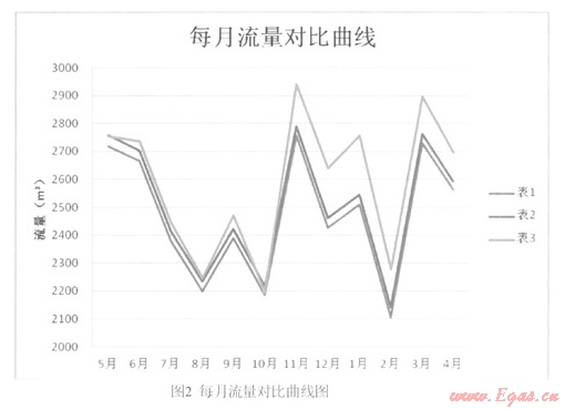 (3)考慮到10月國慶長假、2月春節(jié)長假因素,造成其單月用氣量下降。排除此因素,全年最低用氣量出現(xiàn)在8月,而8月恰好是全年平均氣溫最高的月份。而從整個曲線來看,冬季用氣量明顯上升,夏季用氣黽明顯下降,這與實際情況非常吻合。說明溫度對于用氣量有顯著影響。同時從整個曲線來看,冬季皮膜表的曲線大幅低于標準表(超聲波),夏季則非常接近,說明溫度是影響膜式表誤差的重要因素。