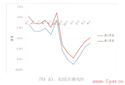 (4)全年表1的誤差為-4.6%左右,表2的誤差為-3.3%左右。表1、表2的平均誤差在-4%左右。此誤差遠大于其±1.5%的允許誤差,因此可以認為氣候條件是造成誤差的主要因素。