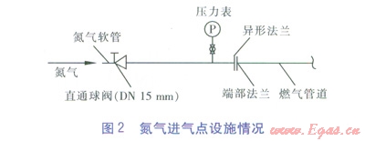 ②現(xiàn)場準(zhǔn)備:核實現(xiàn)場的管道、閥門位置,通過開關(guān)閥門,了解每個閥門是否有效,清楚閥門是否有內(nèi)漏情況(通過閥門開關(guān)及管段壓力變化試驗來確定)。對于關(guān)鍵閥門,如發(fā)現(xiàn)內(nèi)漏或失效情況,要在停氣后更換,為之后的置換做準(zhǔn)備。停氣后將氮氣進氣點設(shè)施按要求安裝。