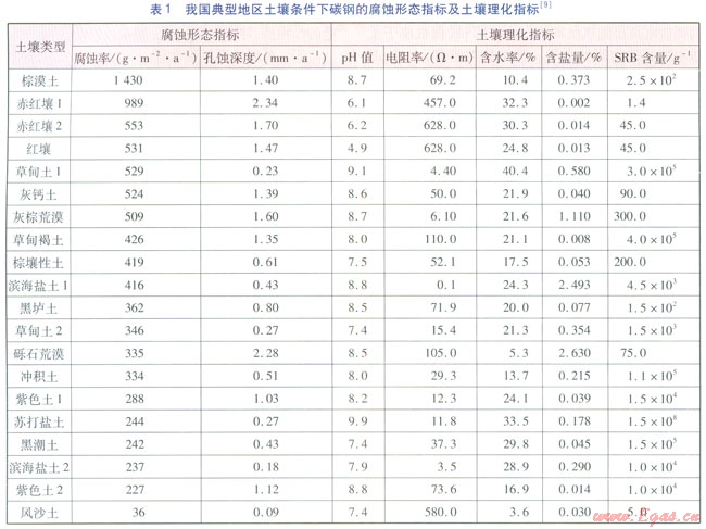埋地鋼質(zhì)燃?xì)夤艿赖母g形態(tài)分為全面腐蝕、局部腐蝕兩類,全面腐蝕是指與土壤相接觸的管道表面均因腐蝕而受到損耗,以腐蝕率表示;局部腐蝕是指腐蝕的發(fā)生局限在結(jié)構(gòu)特定區(qū)域或部位上,以孔蝕深度進(jìn)行評價(jià)。本文給出的我國典型地區(qū)土壤對碳鋼的腐蝕形態(tài)指標(biāo)及土壤理化指標(biāo),來自埋沒于國內(nèi)20個(gè)典型地區(qū)土壤的碳鋼試驗(yàn)件1a的腐蝕數(shù)據(jù)及土壤理化性質(zhì),實(shí)測數(shù)據(jù)與實(shí)際情況接近。