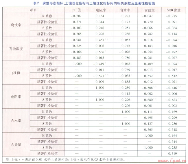 相關(guān)性分析是研究兩個(gè)及以上變量之間相關(guān)程度以及用一定函數(shù)米表達(dá)現(xiàn)象相互關(guān)系的方法。在研究土壤腐蝕問題,建立腐蝕模型時(shí),需確定土壤理化指標(biāo)對金屬腐蝕程度的影響程度(或相關(guān)性),并將那些對土壤腐蝕性影響較大的理化指標(biāo)都包含在腐蝕模型中,才能準(zhǔn)確地對土壤腐蝕性評價(jià)和管道防腐措施進(jìn)行指導(dǎo)。
